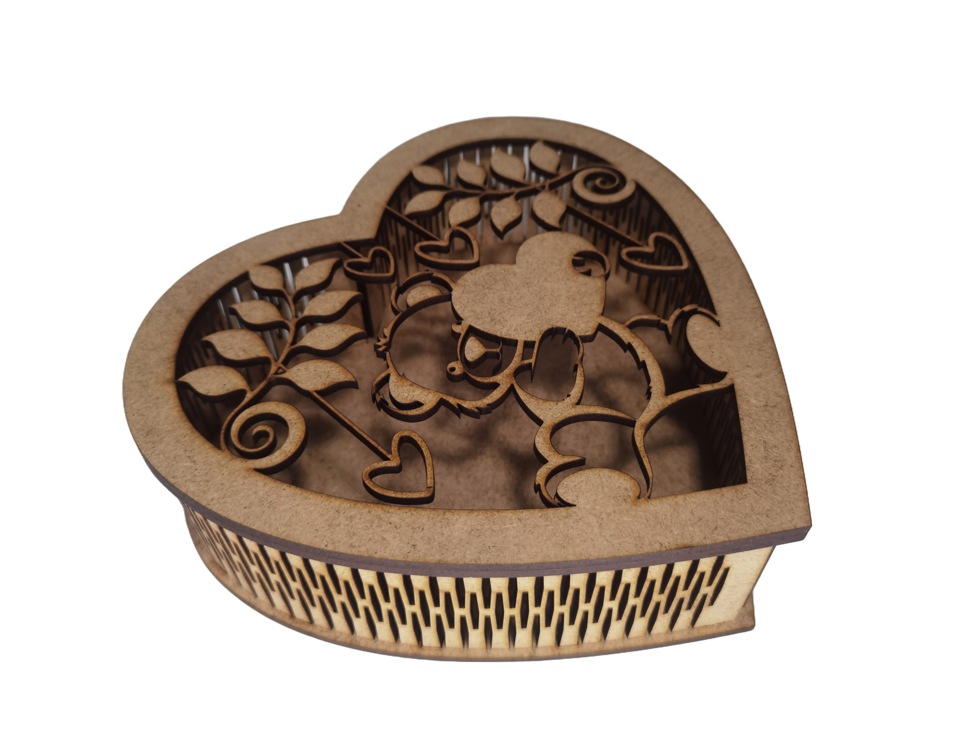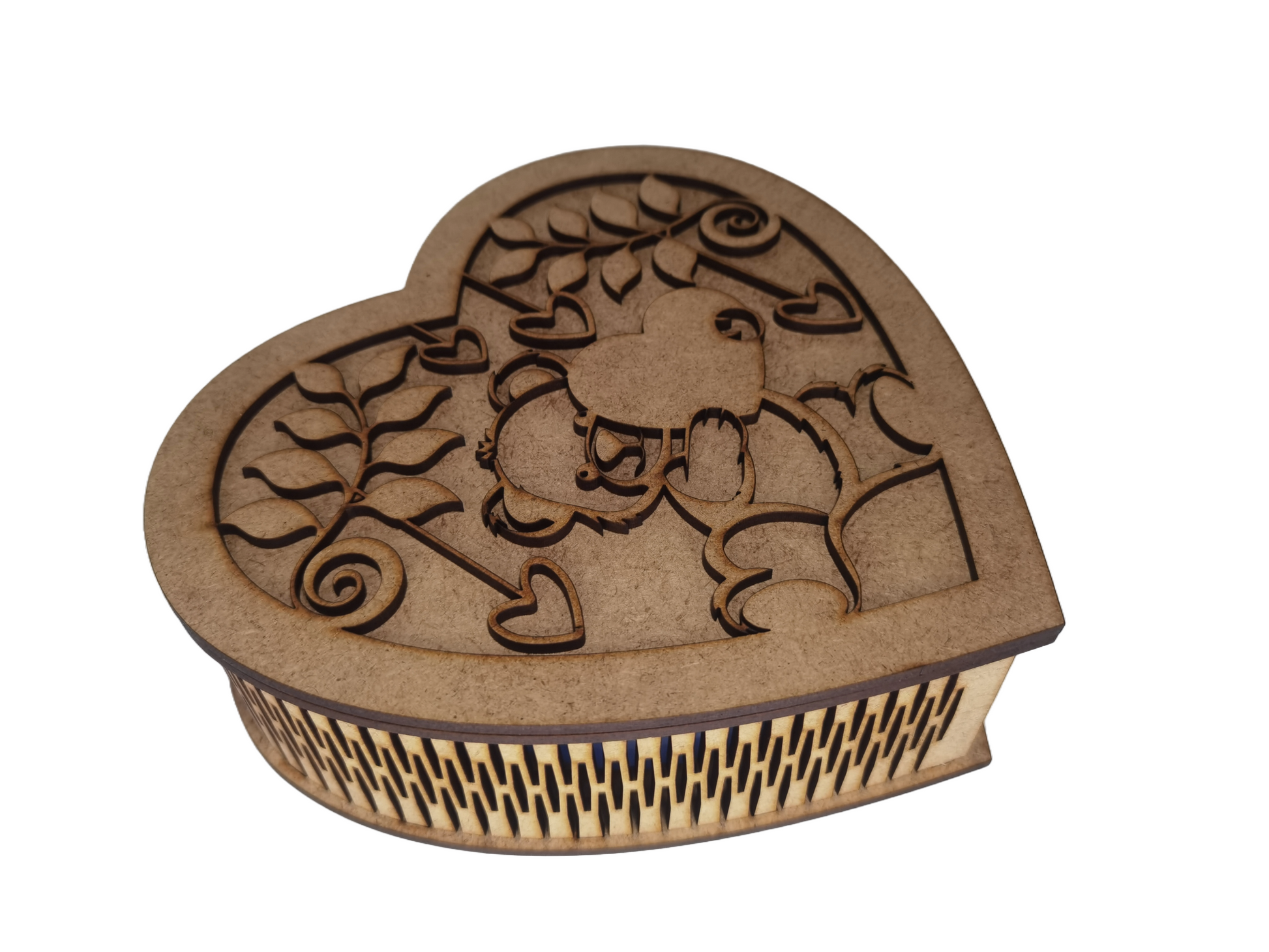 Cofres con forma de corazón diseño Oso para bombones, pétalos, chucherías, joyas... Se puede realizar en tablero Duolite MDF crudo, contrachapado de Calabó y metacrilato de colada, transparente o de colores.