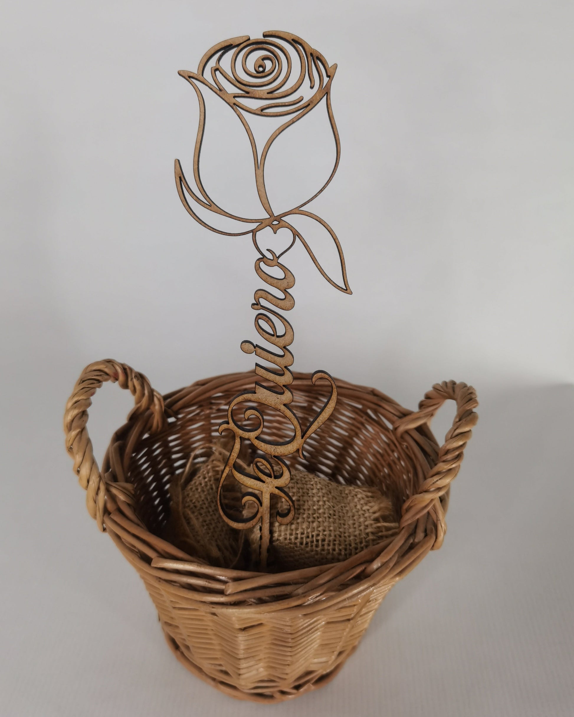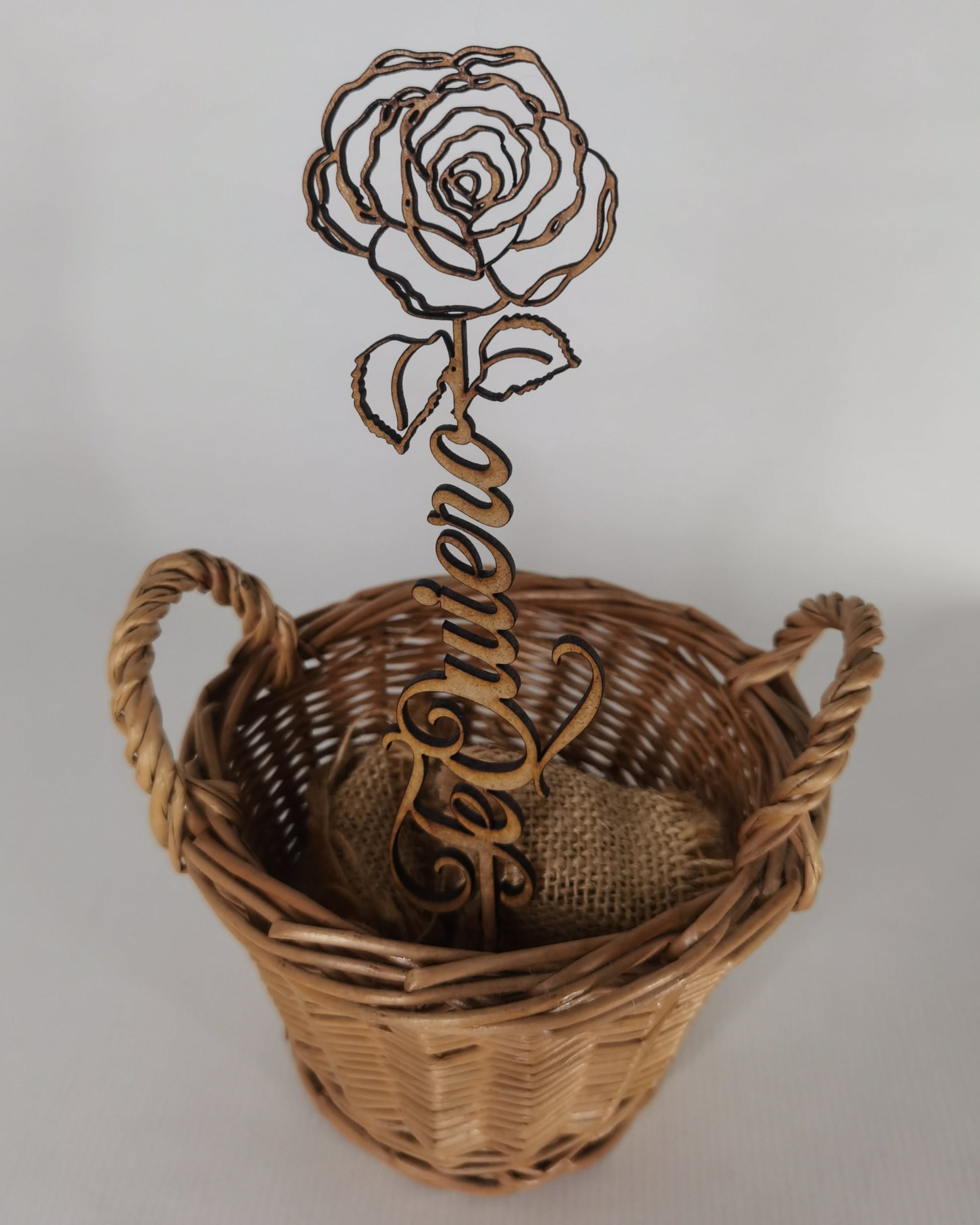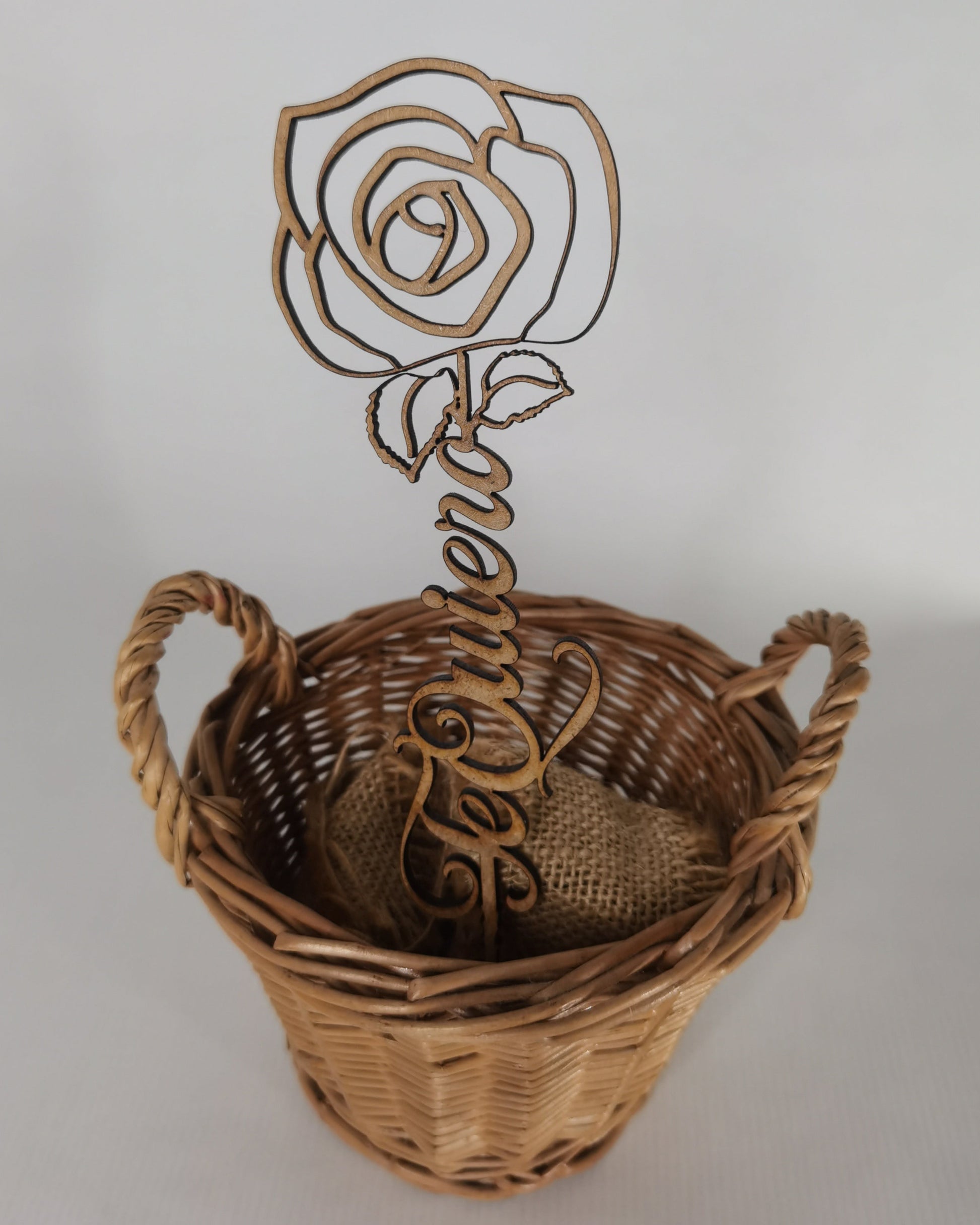 Flores personalizables, de madera MDF, con el nombre o palabra que quieras. También se puede crear en contrachapado de Calabó y metacrilato de colada, transparente o de colores. Cesto no incluido. Consúltanos cualquier duda!