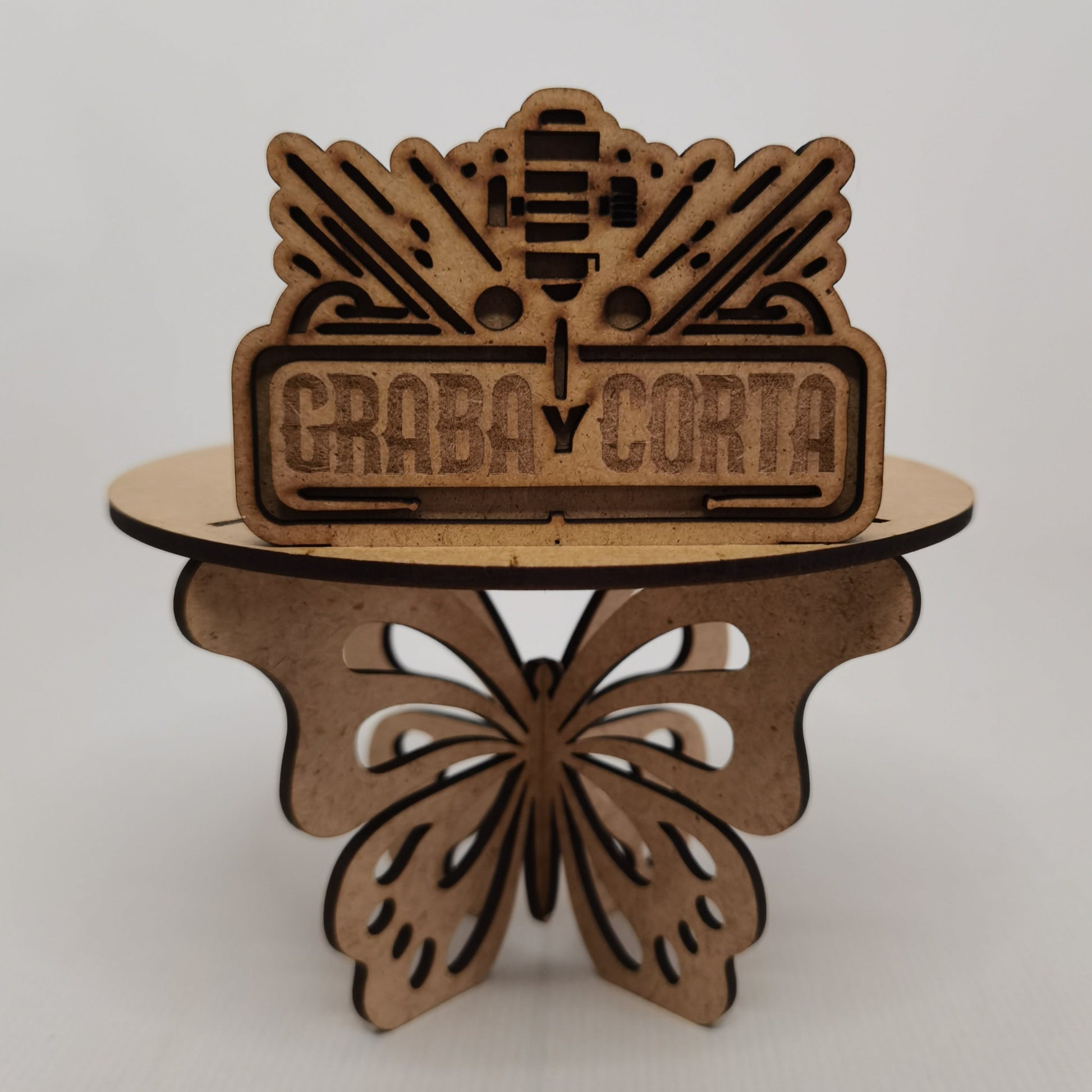 Soporte maceta mariposa en madera MDF cruda con opción de personalizar con nombre o logo.